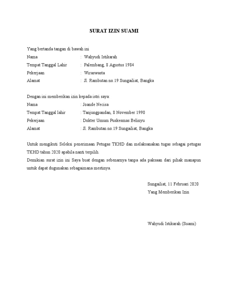 Contoh Surat Izin Suami Gabriel Fletcher Demikian surat keterangan izin ini saya buat dengan sebenar-benarnya agar dipergunakan sebagaimana mestinya. Berikut ini contoh surat pernyataan izin keluarga atas keberangkatan anggota keluarganya untuk bekerja di luar negeri. Bekasi 10 Maret 2022 Nama Suami Stempel Arlan Sani Bagi yang masih single dan ingin bekerja di luar negeri tentunya kami mohon surat izin suami untuk bekerja di luar.